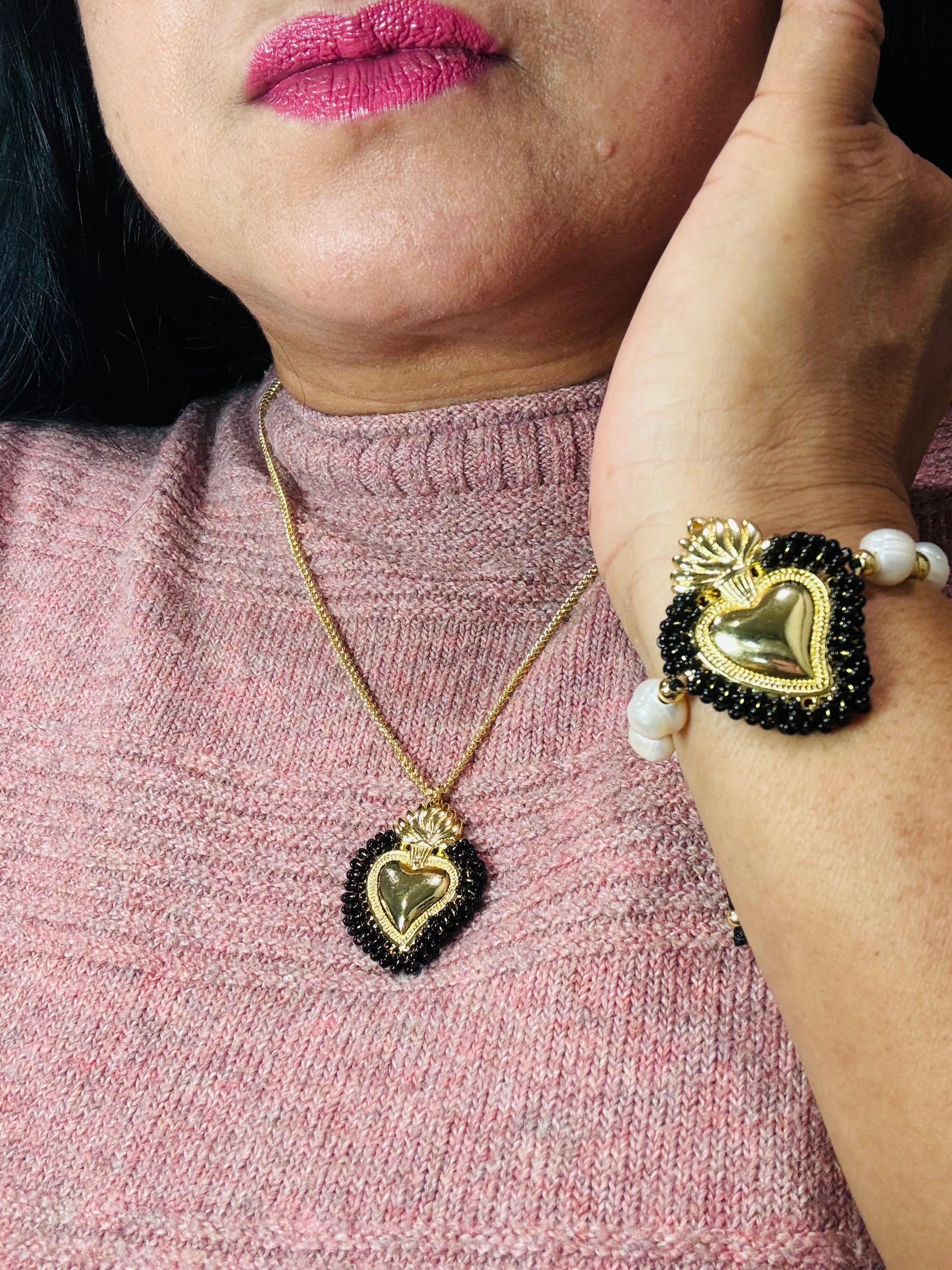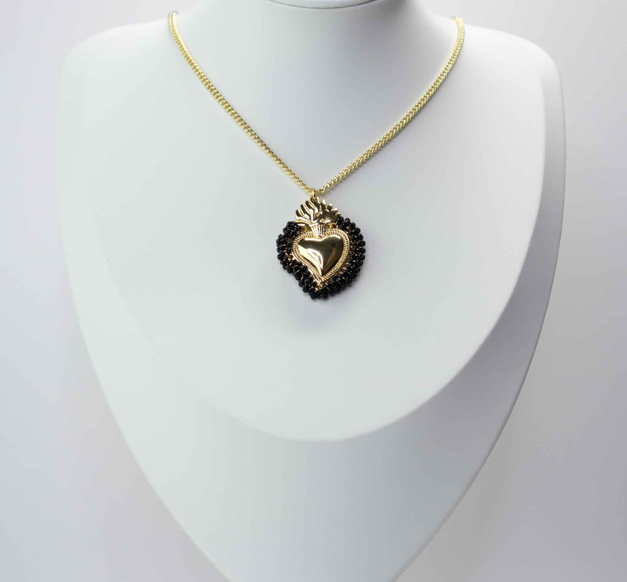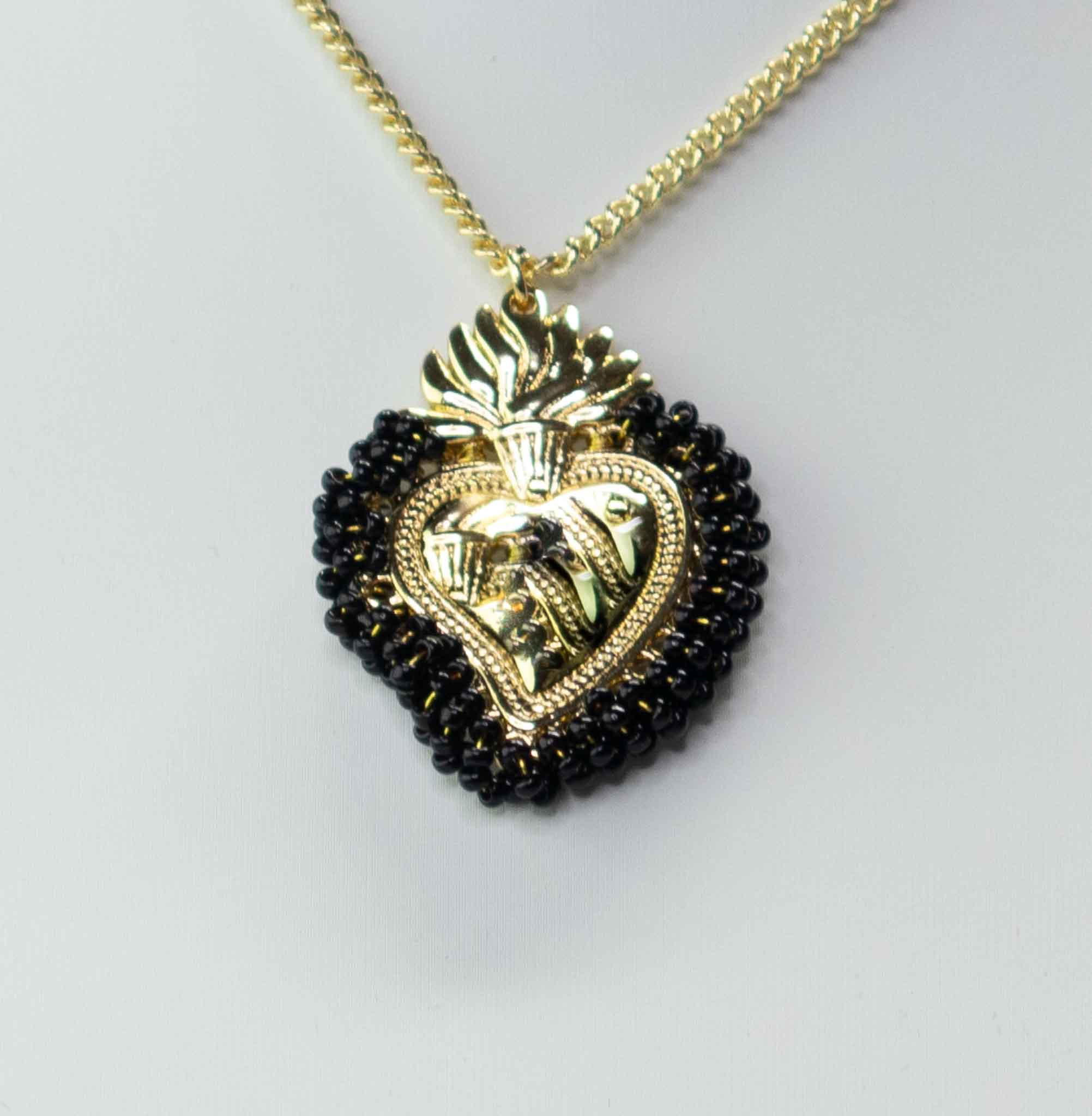 Collar dorado con dije de corazon bordado con mostacilla negras con cadena en Oro laminado.